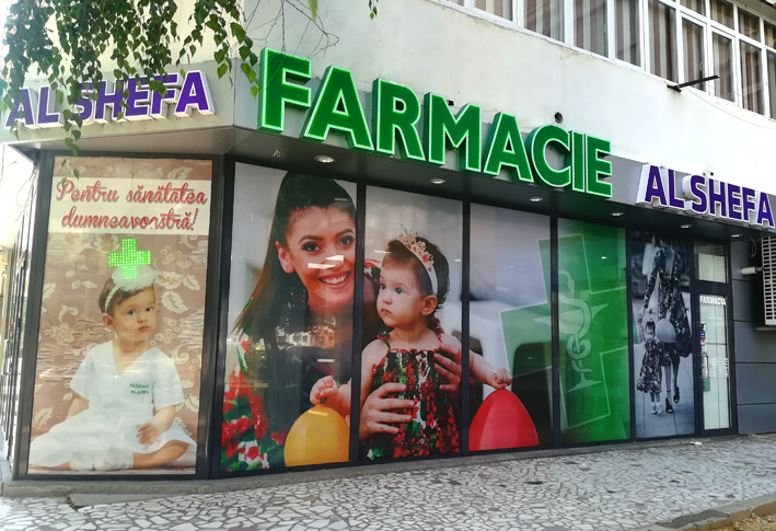 Farmacia AL SHEFA, Decorare geamuri Craiova, colantare geamuri window graphic, stikere geamuri Farmacii, Geamuri Farmacia AL SHEFA, Colantare geamuri PromotionaleCraiova, sablare geamuri Craiova